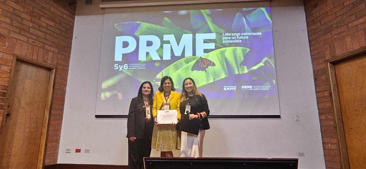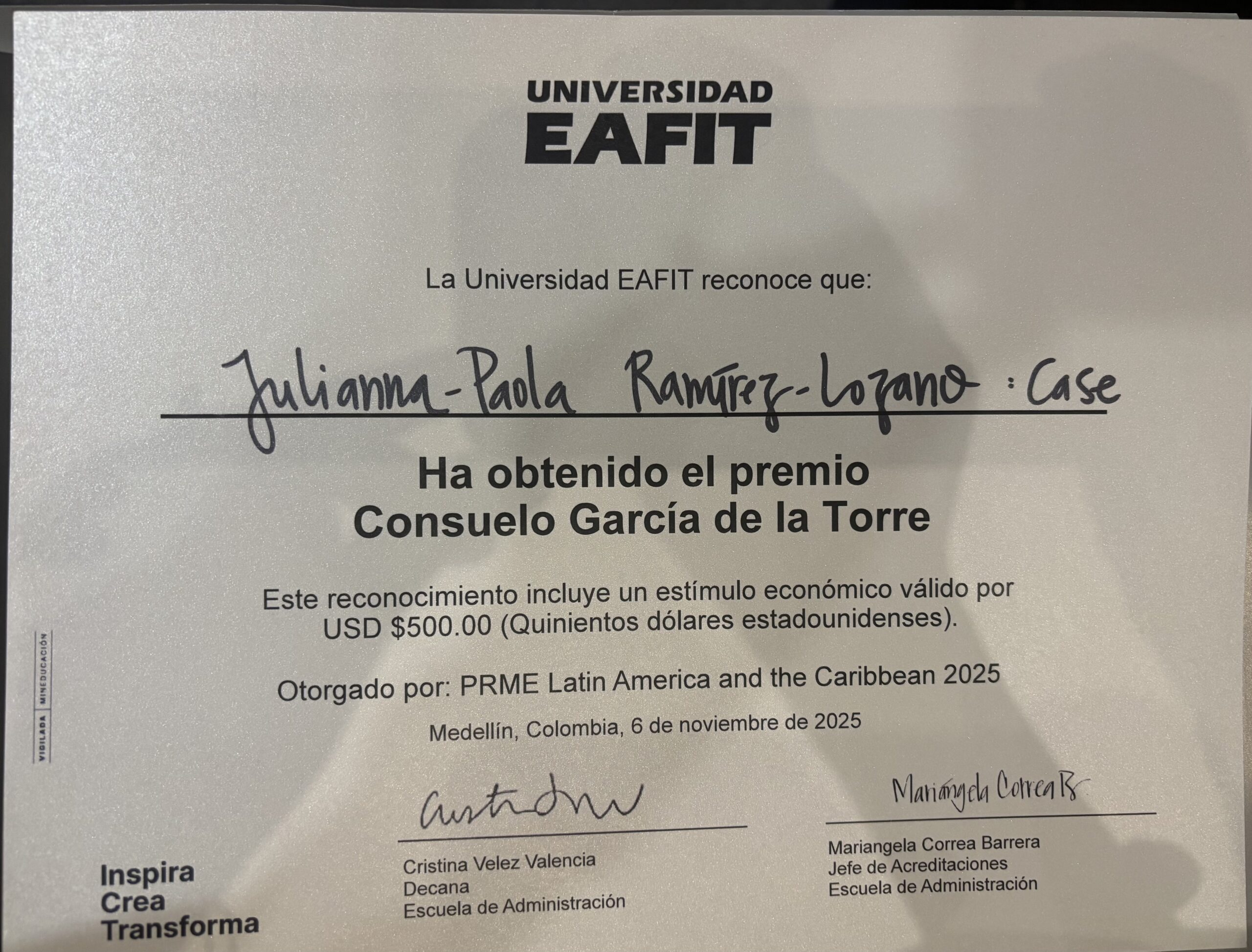 La profesora Julianna Ramirez ganó el premio «Consuelo García De La Torre» por presentar el caso del programa Mujer, que tu negocio crezca más, en el margen del congreso PRME Latin America and the Caribbean 2025, realizado en la Universidad EAFIT, en Medellín, Colombia.