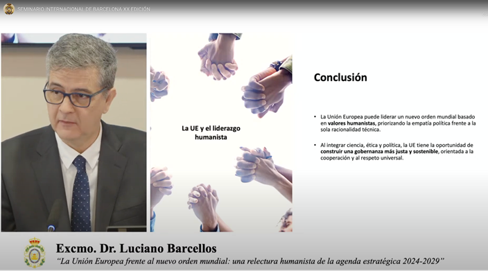 Durante su intervención, el Dr. Barcellos-Paula presentó su más reciente investigación científica: “La Unión Europea frente al nuevo orden mundial: una relectura humanista de la agenda estratégica 2024–2029”. Su análisis aborda el momento crítico que atraviesa la Unión Europea, marcada por desafíos internos —como la desigualdad social, el envejecimiento demográfico y la transición ecológica—, así como por un entorno internacional cada vez más inestable.