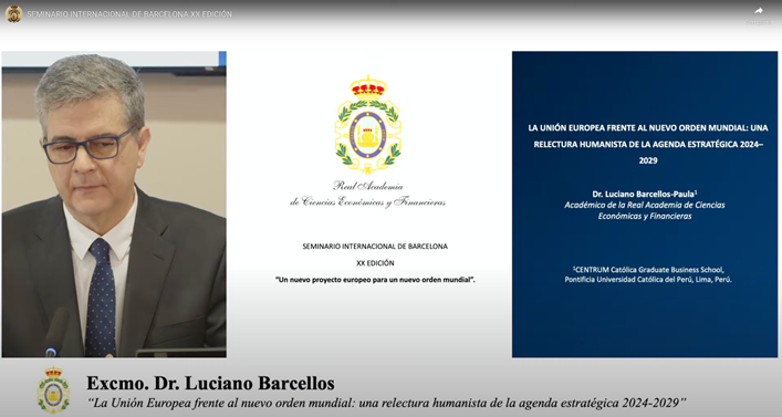 El Dr. Luciano Barcellos-Paula, profesor asociado y director del Observatorio de Innovación y Sostenibilidad de CENTRUM PUCP, así como miembro de la Real Academia de Ciencias Económicas y Financieras (RACEF), participó como ponente en la XX edición del Acto Internacional organizado por la RACEF. El evento, titulado “Un nuevo proyecto europeo para un nuevo orden mundial”, se llevó a cabo en Barcelona los días 19 y 20 de noviembre de 2025.