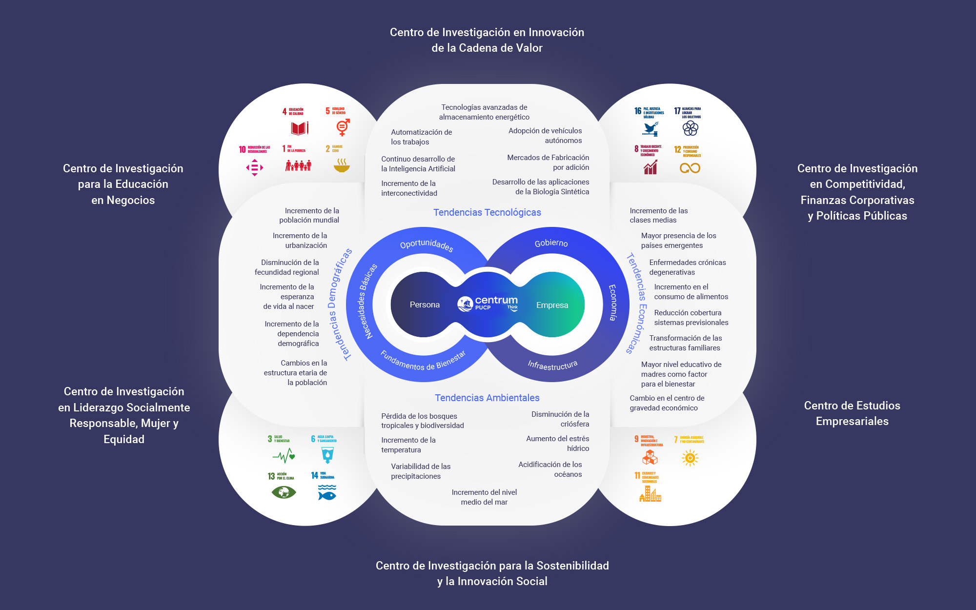 Nos impulsa la necesidad de aportar con relación al rol que juega Centrum PUCP en el contexto mundial, el cual debe ser el nexo entre las personas y las organizaciones. En tal sentido, organizamos nuestra Escuela de tal manera que la producción académica de los centros de investigación esté acorde a las tendencias, tengan un impacto positivo en el bienestar de las personas propiciando el progreso social, así mismo en las organizaciones impulsando su competitividad.